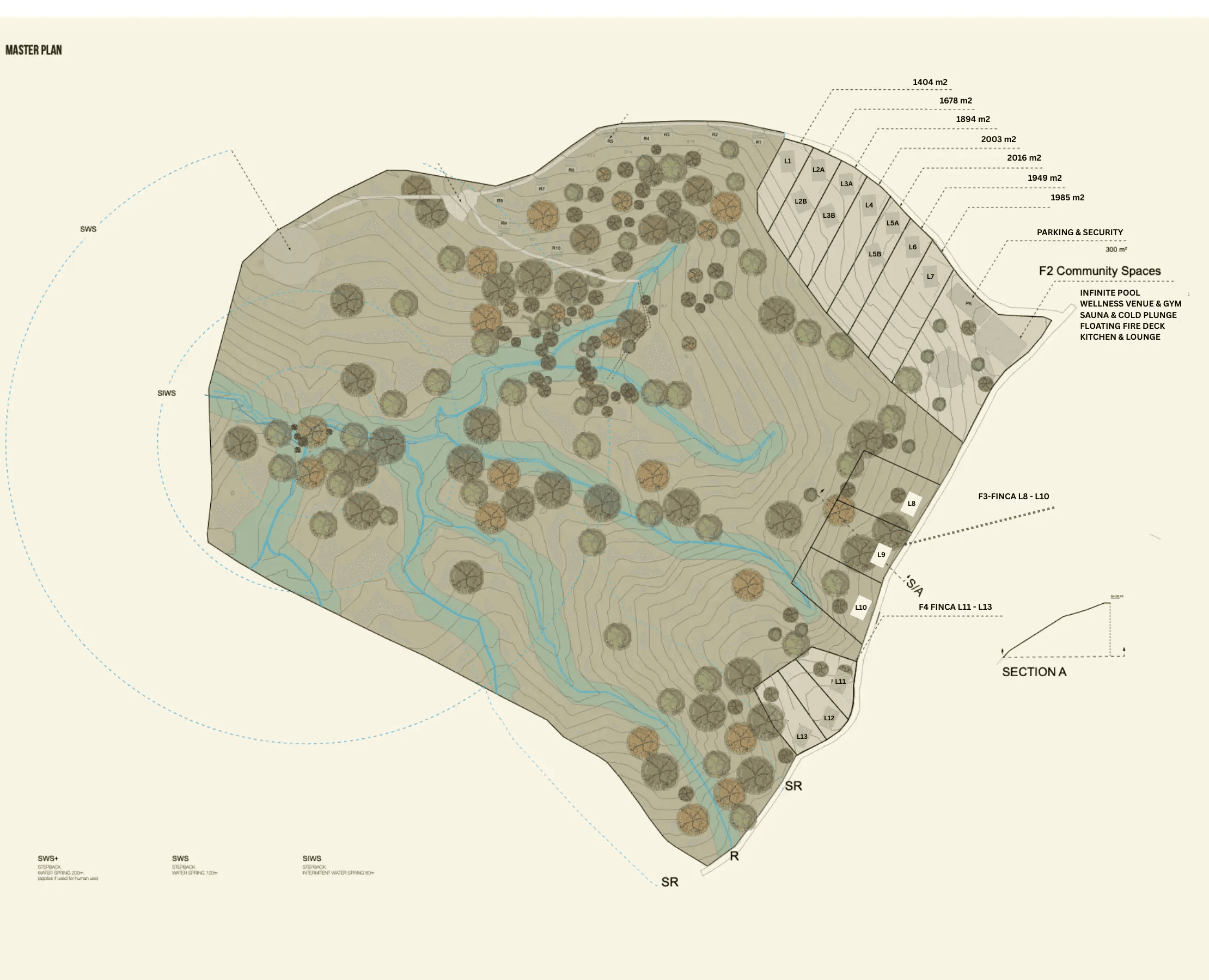 The property has an abundance of water with five natural springs and three creek systems. Seasonal water movement and terrain were mapped first, ensuring roads, homesites, and gardens work with natural flow, reducing erosion, runoff, and long-term maintenance.